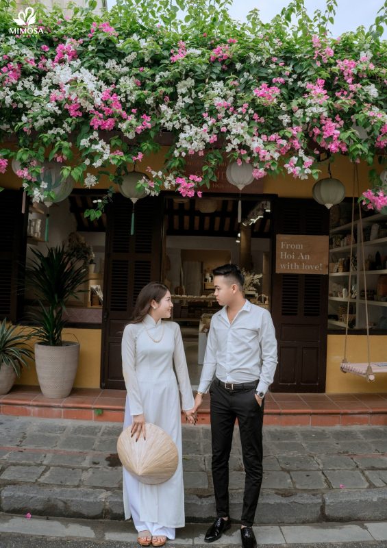 Những bức tường nhà cũ kỹ, những con ngõ rêu phong, mái ngói xiêu vẹo, giàn hoa giấy rực rỡ trước hội quán sẽ là phông nền hoàn hảo cho bộ ảnh cưới “ông bà anh”. Chụp ảnh cưới ở Hội An nên mặc gì cũng được rất nhiều người hỏi. Tư thế chụp ảnh đẹp ở Hội An rất đơn giản, cô dâu trong tà áo dài thướt tha bước đi bên chú rể, cả hai trao nhau ánh mắt đắm đuối. Tất cả những điều đơn giản đó sẽ tạo nên một album ảnh cưới đầy hoài niệm và nghệ thuật.